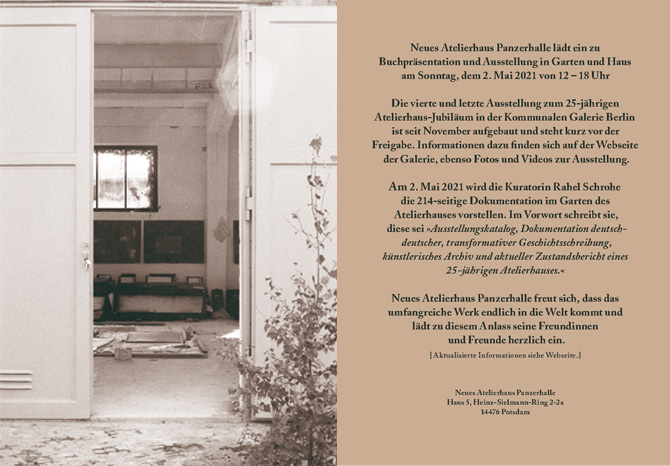 Außerdem weisen wir schon jetzt auf die Präsentation der umfangreichen 214-seitigen Dokumentation 25 Jahre Atelierhaus Panzerhalle am 2. Mai im Garten des Atelierhauses hin.
