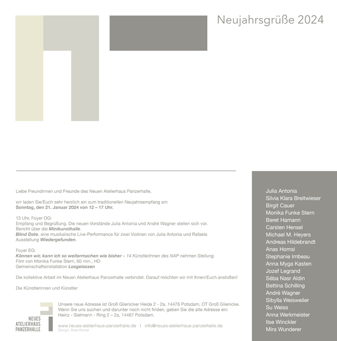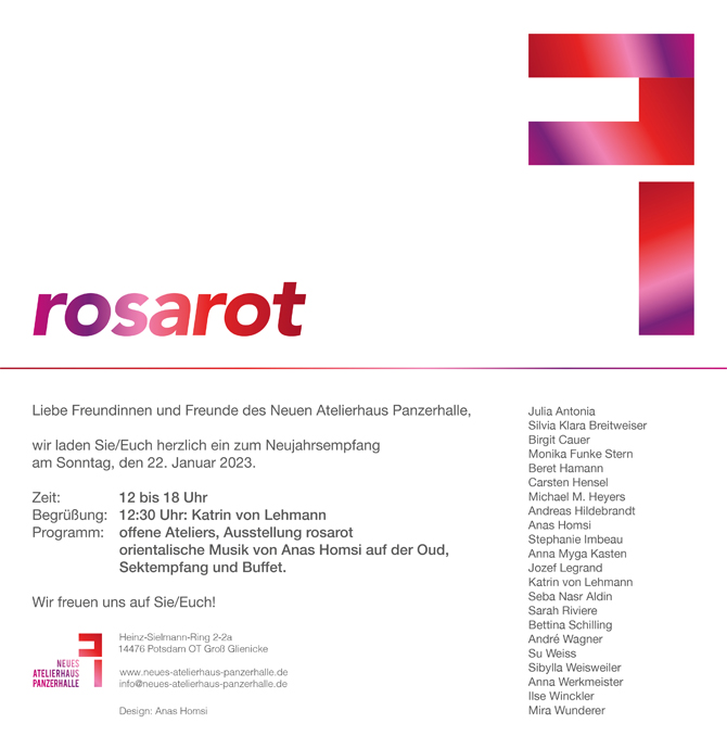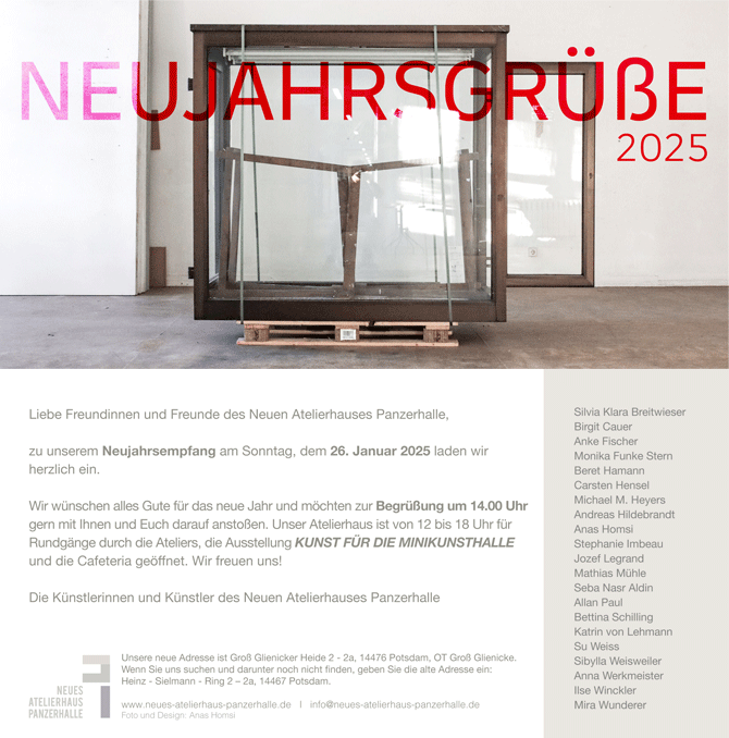 zu unserem diesjährigen Neujahrsempfang am 26. Januar laden wir Sie/Euch ganz herzlich in unser Atelierhaus ein. Um 14 Uhr ist die Begrüßung, anschließend möchten wir mit Euch/Ihnen gern auf das neue Jahr anstoßen. Unsere Ateliers sind von 12 - 18 Uhr geöffnet und wir freuen uns auf viele interessierte Besucher*innen. Einladung