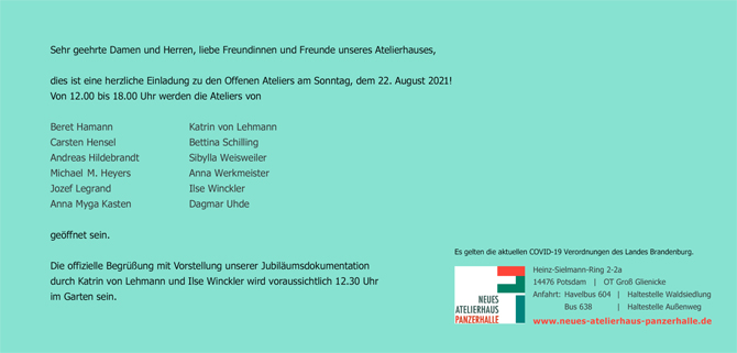 Wir hatten uns sehr gewünscht, unsere Jubiläumsdokumentation im Frühling im Atelierhaus-Garten zu präsentieren, an der frischen Luft mit einem Glas Sekt in der Hand, um zusammen mit Ihnen/Euch nachträglich auf unser Jubiläum anstoßen zu können. Die Einladungskarte dazu ist überholt.