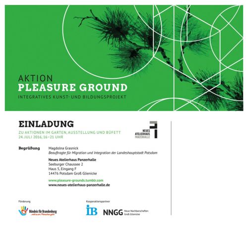Die Künstler des Neuen Atelierhaus Panzerhalle laden mit Aktion Pleasure Ground zum dritten Aktionstag dieses Jahres nach Groß Glienicke ein. Beim diesjährigen Ausstellungs- und Integrationsprojekt schufen sie – inspiriert von den historischen Pleasuregrounds im Park Babelsberg und Schlosspark Glienicke – zusammen mit den Geflüchteten der benachbarten Gemeinschaftsunterkunft im Garten des Atelierhauses einen künstlerisch gestalteten Aktions- und Kommunikationsraum. Die durch einen Zaun manifestierte Teilung des gemeinsamen Gartens von Atelierhaus und Flüchtlingsunterkunft wurde dabei teilweise künstlerisch überwunden.
