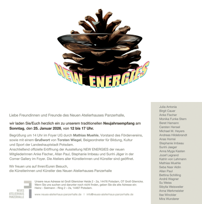 Anschließend offizielle Eröffnung der Ausstellung NEW ENERGIES der neuen Mitgliederinnen Anke Fischer, Allan Paul, Stephanie Imbeau und Sunhi Jaeger in der Corner Gallery im Foyer. Die Ateliers aller Künstlerinnen und Künstler sind geöffnet.